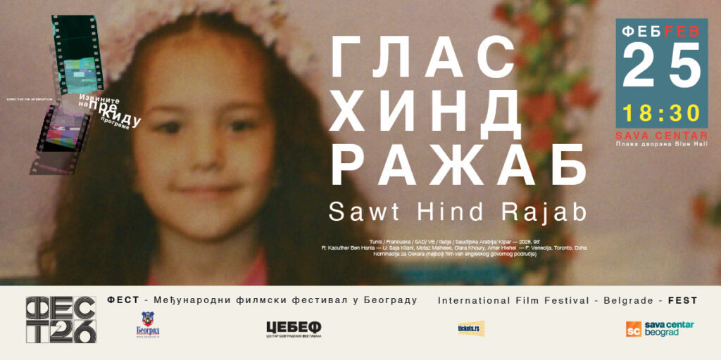 GLAS HIND RAŽAB / Sawt Hind Rajab Država: Tunis, Francuska, 2025. Žanr: Drama Trajanje: 89’ Režija i scenario: Kaouther Ben Hania Uloge: Saja Kilani, Motaz Malhees, Amer Hlehel, Clara Khoury Produkcija: Mime Films, Tanit Films Trejler: The Voice of Hind Rajab – Official Trailer PROJEKCIJA 25.2.2026. | 18:30 Sava Centar, Plava dvorana SINOPSIS NAPOMENA: Film je zasnovan na stvarnim događajima i hitnim pozivima koje je […]
