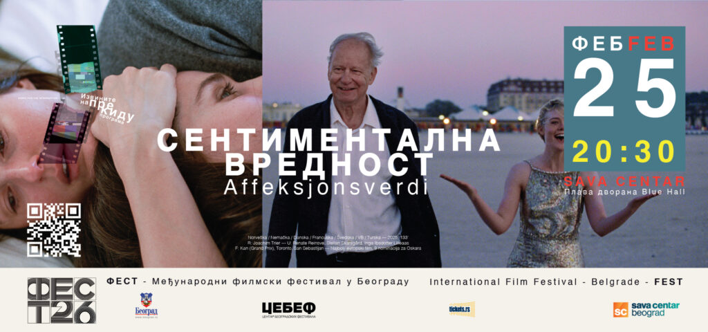 SENTIMENTALNA VREDNOST / Affeksjonsverdi Država: Norveška, Nemačka, Danska, Francuska, Švedska, UK, Turska / 2025. Žanr: Drama Trajanje: 133’ Režija: Joachim Trier Scenario: Joachim Trier, Eskil Vogt Uloge: Renate Reinsve, Stellan Skarsgård, Inga Ibsdotter Lilleaas, Elle Fanning Produkcija: Mer Film, Eye Eye Pictures, MK2 Productions Trejler: SENTIMENTALNA VREDNOST (SENTIMENTAL VALUE) – TREJLER PROJEKCIJA 25.2.2026. | 20:30 Sava Centar, Plava dvorana SINOPSIS Reditelj i scenarista Joakim […]